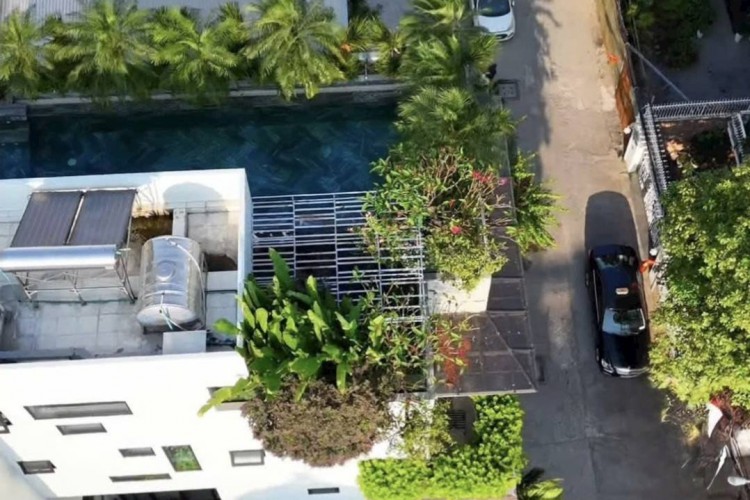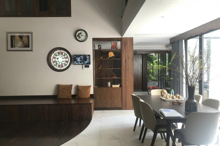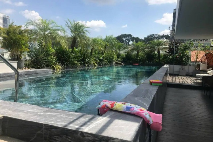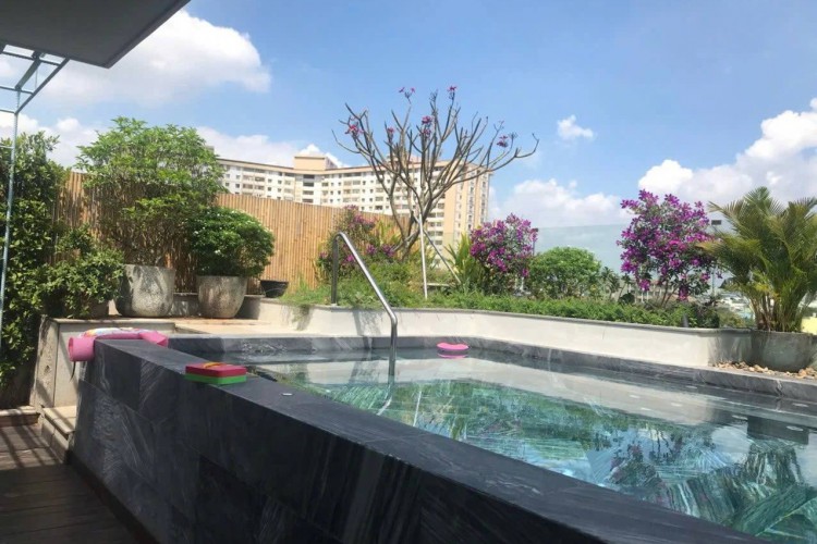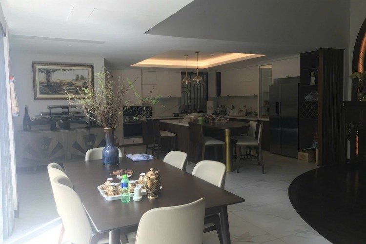 Hiện trạng: 1 hầm + 5 tầng, thang máy, hồ bơi, 8PN (5 master), nội thất cao cấp, hầm đậu 2 ô tô.