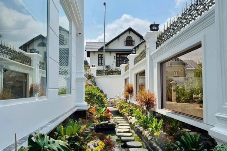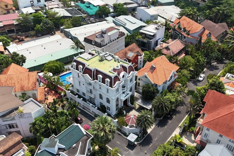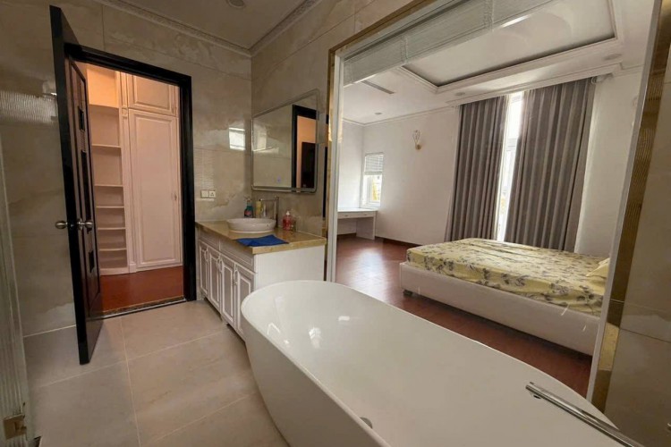 Hiện trạng: Biệt thự 3 tầng + áp mái, thiết kế sang trọng, sân vườn rộng, hồ bơi riêng, gồm 6 phòng ngủ.