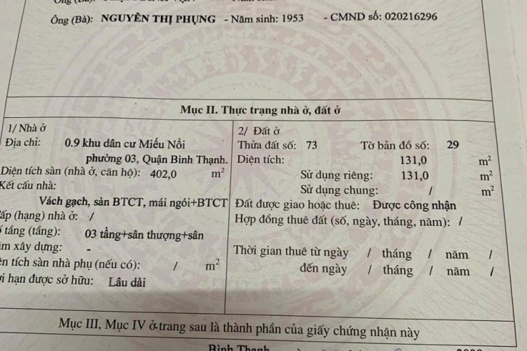Hiện trạng: 3 tầng + sân thượng (có phòng giặt & mái áp); tổng diện tích sàn 402m²; nhà đẹp, rộng, phù hợp an cư hoặc làm văn phòng – spa – căn hộ dịch vụ cao cấp.