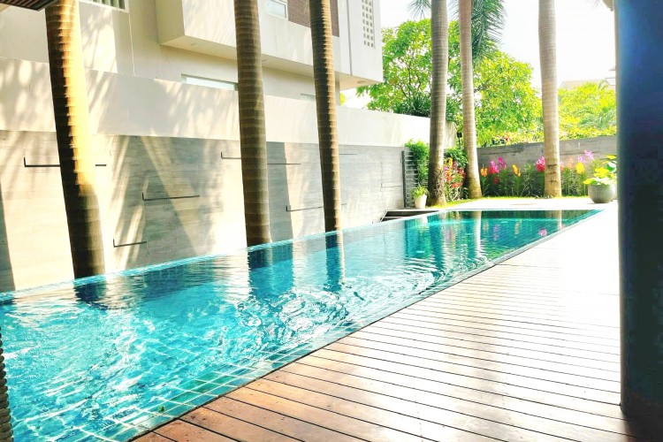 Diện tích: 15 × 20m (300m²); kết cấu hầm – trệt – lửng – 2 lầu; hồ bơi riêng; sân vườn rộng.