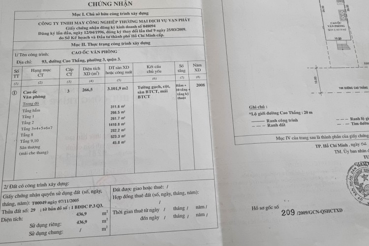 Hiện trạng: Hầm + 10 tầng + mái che thang, tổng DTSD ~3.100m², khai thác ổn định.